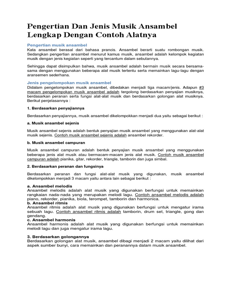 Sebutkan Dan Jelaskan Bentuk Penyajian Musik Ansambel ... from s1.studylibid.com Pengertian, jenis pengelompokan musik ansambel lengkap dengan contoh alatnya adalah pembahasan utama materi pelajaran seni dan budaya yang akan dijelaskan dengan lengkap dan detail pada materi belajar berikut ini. Biasanya, partitur lebih sering digunakan untuk menuliskan notasi musik pada piano. Seni tersebut dinamakan musik ansambel, tetapi tahukah kalian apa pengertian musik ansambel. Orang atau sekelompok orang dan juga jumlah alat musik tertentu, baik alat musik sejenis maupun alat musik yang berbeda. Ansambel dengan alat musik sejenis. Ansambel gitar, ansambel rekorder, dan. Mungkin anda pernah mendengar kata musik ansambel? Berdasarkan cara penyajiannya, musik ansambel dibagi menjadi dua yakni: