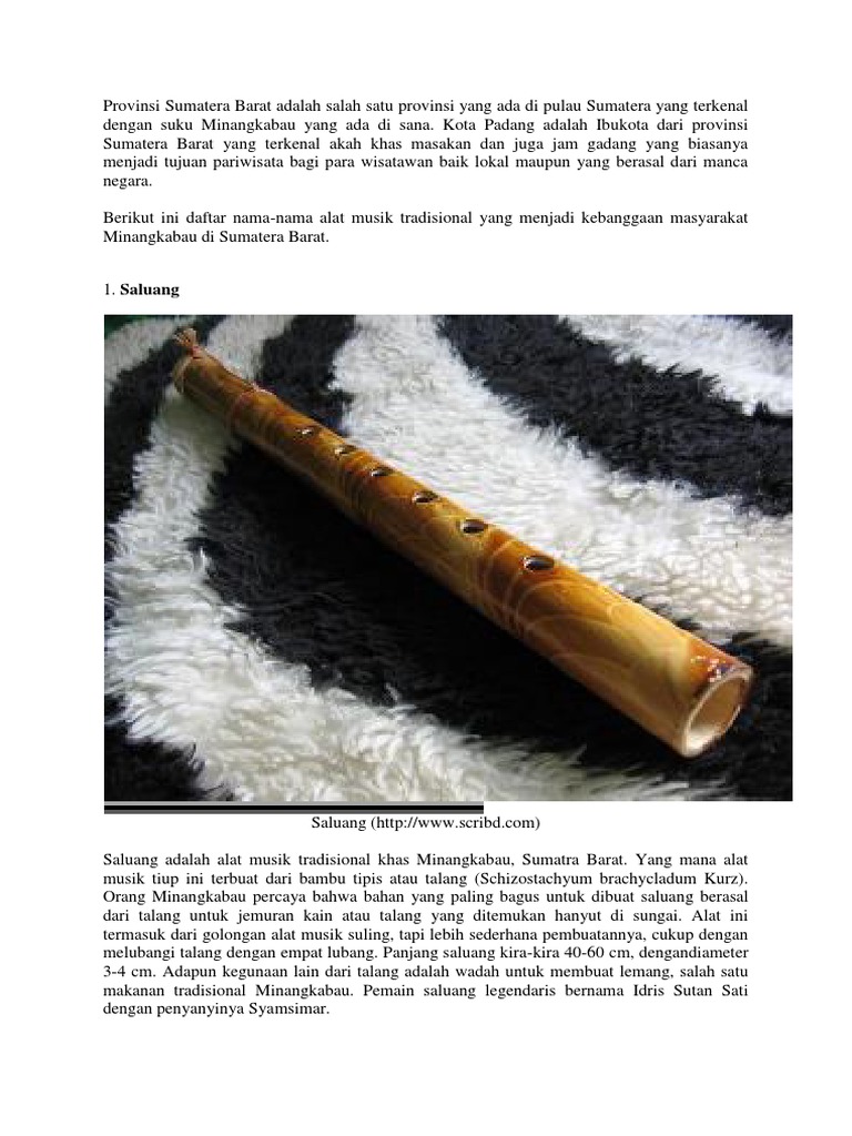 Fungsi dari alat musik ini lebih dominan sebagai kode atau isyarat bagi masyarakat setempat. Yang anda lihat mungkin hanya sebagian kecil dari kategori alat musik tiup. Gambar alat musik tradisional sumatera barat saluang. Saluang terbuat dari bambu tipis yang disebut dengan talang. Namun, jika dalam kebudayaan sunda, alat musik suling terbuat dari bambu dan memilik empat hingga enam lubang sebagai pengatur melodi dari yang hasilkan oleh alat musik tiup ini. Terbangan adalah alat musik yang terdiri dari 4 buah rebana dan dimainkan dengan cara dipukul. Celempung terbuat dari kulit bambu dengan memanfaatkan resonansi yang ada dalam ruas batang bambu untuk menghasilkan suara. Ada banyak jenis alat musiknya yang menarik untuk dikenali oleh siapa saja, tidak hanya mereka yang sedang belajar di sekolah atau perguruan tinggi. Saluang saluang adalah alat musik tradisional khas minangkabau,sumatra barat. Karinding daapt terbuat dari bambu ataupun. Angklung adalah alat musik tradisional berasal dari jawa barat. Serunai adalah alat musik yang bisa dimainkan secara solo ataupun beriringan dengan alat musik lainnya dalam sebuah pertunjukan musik. Talempong berasal dari sumatera barat yang cara memainkannya dengan dipukul menggunakan kayu.