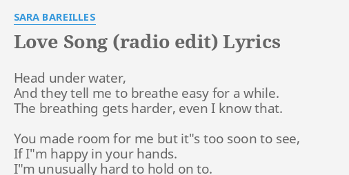 In 2018, npr ranked this as the #180 greatest song by a female or nonbinary artist in the 21st century, saying: The earth that is the space between. To help me see daylight, my guide, gone. I'm not gonna write you a love song 'cause you tell me it's make or break in this if you're on your way i'm not gonna write you to stay if your heart is nowhere in it i don't want it for a minute babe, i'll walk the seven seas when i believe that there's a reason to write you a love song today today, yeah. To write you a love song today. Sip on the southern rain, as i do. Head under water and they tell me to breathe easy for a while the breathing gets harder, even i know that you made room for me but it's too soon to see if i'm happy in your hands If all you have is leaving. Sara bareilles love song with lyrics and a few pics thrugh out the song Head under water and they tell me to breathe easy for a while the breathing gets harder, I don't look don't touch don't do anything. 'love song,' sara bareilles' 2007 breakthrough single, was never. Lyrics to 'love song' by sara bareilles: