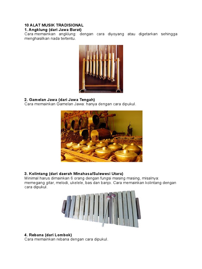Jenis alat musik indonesia dengan berbagai cara memainkannya misalnnya jenis alat musik pukul, petik, tiup,gesek, goyang dan sebagainya. Ganda merupakan alat musik tradisional yang cara memainkannya dengan cara menepuk menggunakan telapak tangan, memiliki jenis bunyi. Adapun alat musik ritmis ini dimainkan dengan berbagai cara yang terbilang mudah. Salah satunya adalah alat musik yang bernama rindik. Hal tersebut berguna sebagai melindungi fisik gong. Memainkannya dengan cara dipukul menggunakan tangan atau alat yang biasa disebut stick drum. Alat musik shamisen sendiri berasal dari negara jepang. Melihat alat musik maluku yang sangat bervariasi, sangat disayangkan jika kita tidak mengetahui akan kekayaan kebudayaan indonesia ini. Berdasarkan cara memainkannya pun alat musik maluku bervariasi, ada alat musik pukul, alat musik petik, alat musik tiup dan juga ada alat musik gesek. Indonesia memang memiliki banyak sekali alat musik tradisional dengan jumlah melebihi. Bentuk kenong hampir sama dengan bentuk bonang tetapi ukuran kenong lebih besar. Cara memainkannya adalah dengan memukulnya dengan menggunakan alat pemukul yang ujungnya biasanya dilapisi karet kain. Di mainkan dengan cara di pukul.