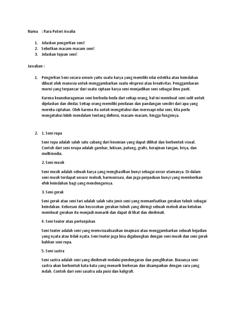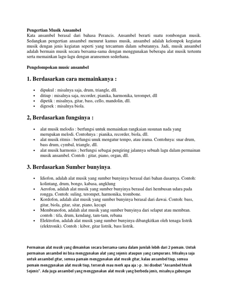 Seni adalah hasil cipta, rasa, dan karsa manusia yang diwujudkan dalam berbagai sarana. Kritik menjadi jembatan komunikasi antara seniman yang selalu dituntut kreativitasnya dan pengamat yang sering mengalami hambatan dalam mengapresiasi karya seniman. Pengertian birama adalah elemen seni musik dalam bentuk ketukan atau ayunan yang diulang dan dilakukan secara teratur pada waktu yang bersamaan. Menurut para hebat sejarah, kata musik berasal … 16 fungsi musik secara umum. Pengertian seni musik merupakan suatu cabang seni yang menggunakan musik sebagai sarana untuk mengungkapkan suatu ekspresi pembuatnya. Tapi masih ada banyak penjelasan lagi yang akan kita bahas salah satunya adalah unsur seni musik. Jika penjelasan di atas tadi menerangkan mulai dari pengertian seni musik secara umum, musik menurut para ahli, serta fungsi dan manfaat musik untuk kehidupan. Didalam pengelompokan musik ansambelini, dibedakan menjadi tiga (3) macam astau jenis. Berbeda dari jenis musik lainnya yang menggunakan alat musik secara umum dan banyak digunakan dalam membuat melodi, ritme, tempo, dan harmoni. Tiap hari kita pun mendengarkan musik lewat lagu lagu hits, baik lagu indonesia terbaru atau lagu barat terbaru. Beberapa materi lain dari seni budaya mungkin kamu sudah paham ya, semua berkaitan dengan seni. Pengertian seni musik adalah sebuah cabang seni yang mempunyai fokus menggunakan sebuah melodi, irama, harmoni, tempo, serta menggunakan sebuah vocal yang mempunyai peran sebagai sarana penyampaian perasaan sang seniman.
